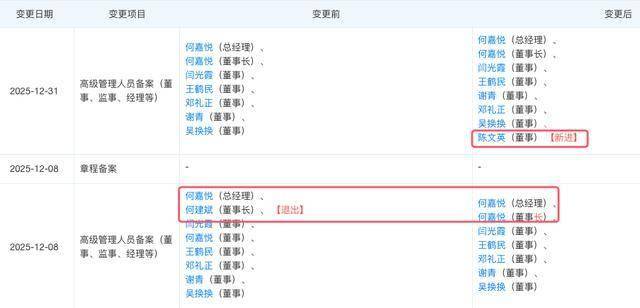天眼查显示,2025年12月,72岁的何建斌退任董事长,其子何嘉悦接任,何嘉悦母亲陈文英新进董事。