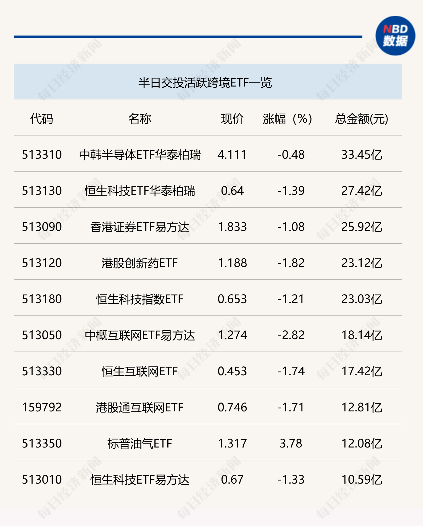 今日上午,调整幅度较大的有色金属ETF(512400)、电网设备ETF(159326)和化工ETF(159870)成交金额较大,上述三只ETF半日成交金额均超过10亿元。跨境ETF方面, 中韩半导体ETF华泰柏瑞(513310)半日成交33.45亿元,成交金额相对较大。