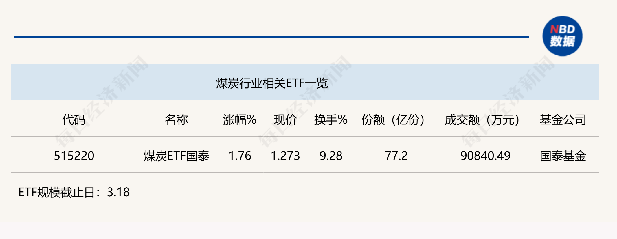点评:煤炭ETF(515220)今日上午涨幅达到1.76%,该ETF份额为77.2亿份,半日成交金额达9.08亿元,其追踪的中证煤炭指数选取涉及煤炭开采、煤炭加工等业务的上市公司证券作为指数样本,以反映煤炭类相关上市公司证券的整体表现。