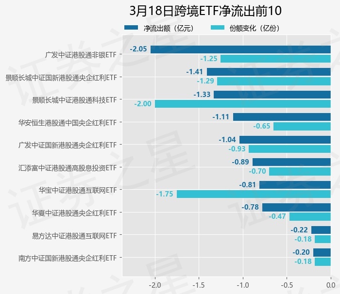 当日有27只跨境ETF基金出现资金净流出,其中净流出排首位的是广发中证港股通非银ETF(513750),份额减少了1.25亿份,净流出额为2.05亿元。