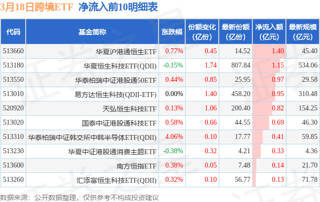 当日有38只跨境ETF基金出现资金净流入,其中净流入排首位的是华夏沪港通恒生ETF(513660),份额增加了4500.0万份,净流入额为1.4亿元。
