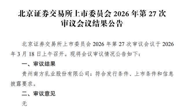 瑞财经 刘治颖 3月18日,据北交所披露,贵州南方乳业股份有限公司(以下简称:南方乳业)符合发行条件、上市条件和信息披露要求。