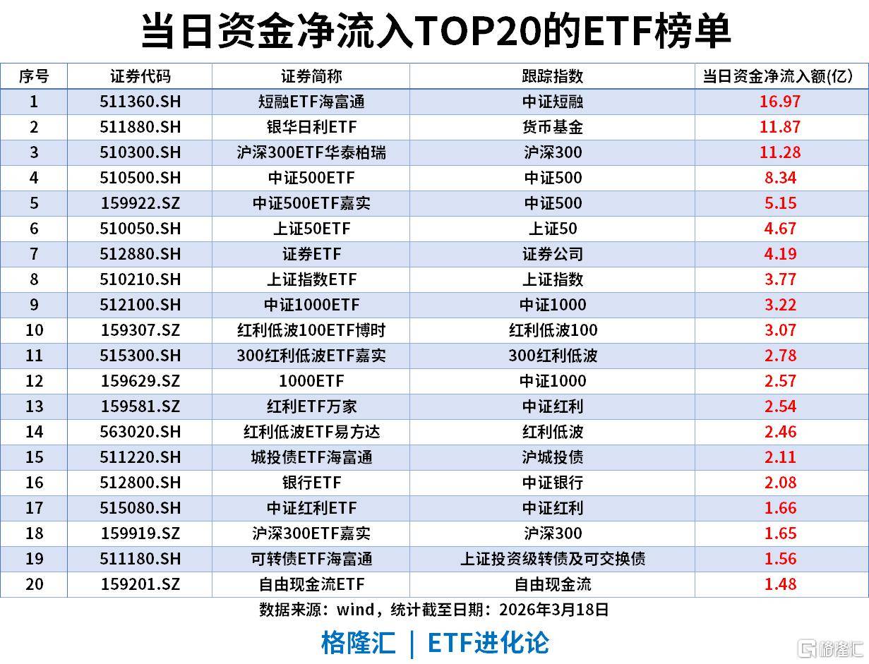 当日ETF资金净流入TOP20(截至2026-03-18)