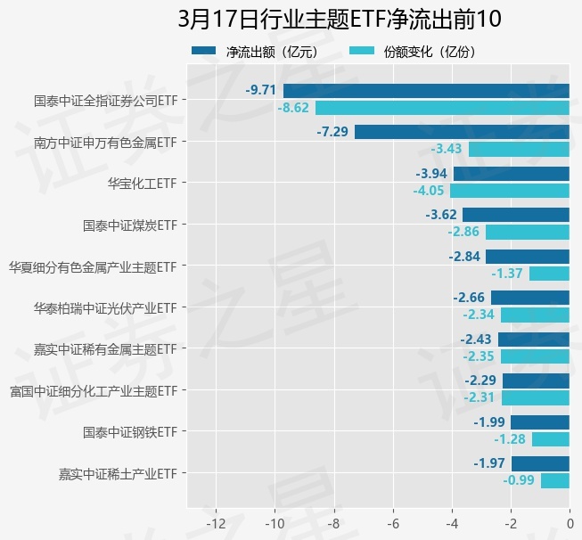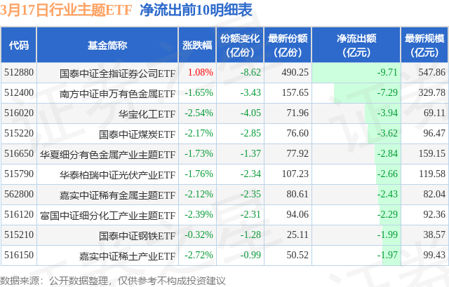 当日有137只行业主题ETF基金出现资金净流出,其中净流出排首位的是国泰中证全指证券公司ETF(512880),份额减少了8.62亿份,净流出额为9.71亿元。