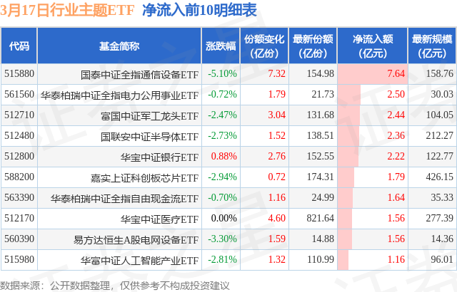 当日有118只行业主题ETF基金出现资金净流入,其中净流入排首位的是国泰中证全指通信设备ETF(515880),份额增加了7.32亿份,净流入额为7.64亿元。