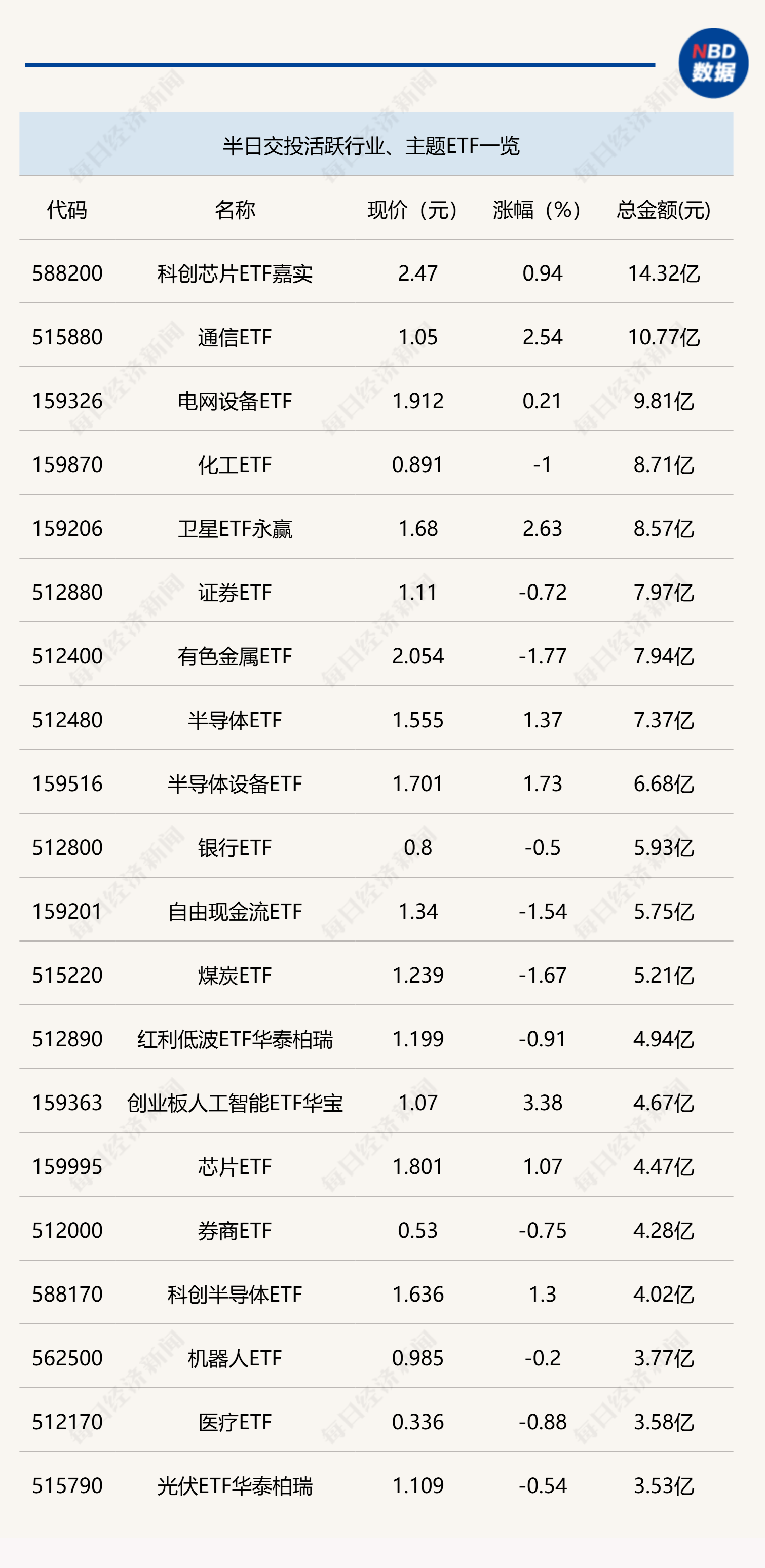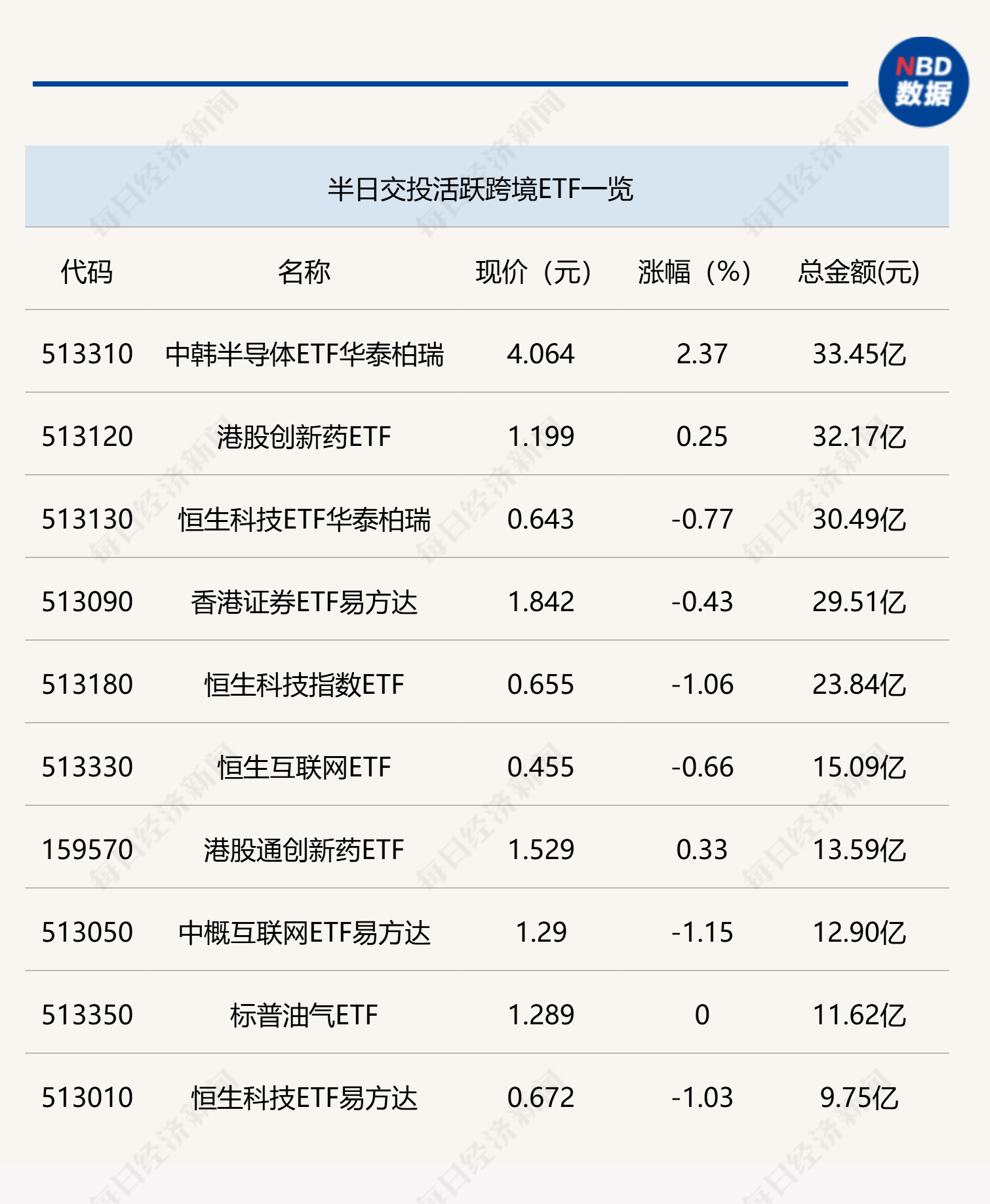 今日上午,行业、主题ETF成交缩量明显,仅科创芯片ETF嘉实(588200)和通信ETF(515880)半日成交金额超过10亿元;跨境ETF方面, 中韩半导体ETF华泰柏瑞(513310)半日成交金额达到33.45亿元,交易相对活跃,而昨日大幅放量的香港证券ETF易方达(513090)半日成交金额仅29.51亿元。