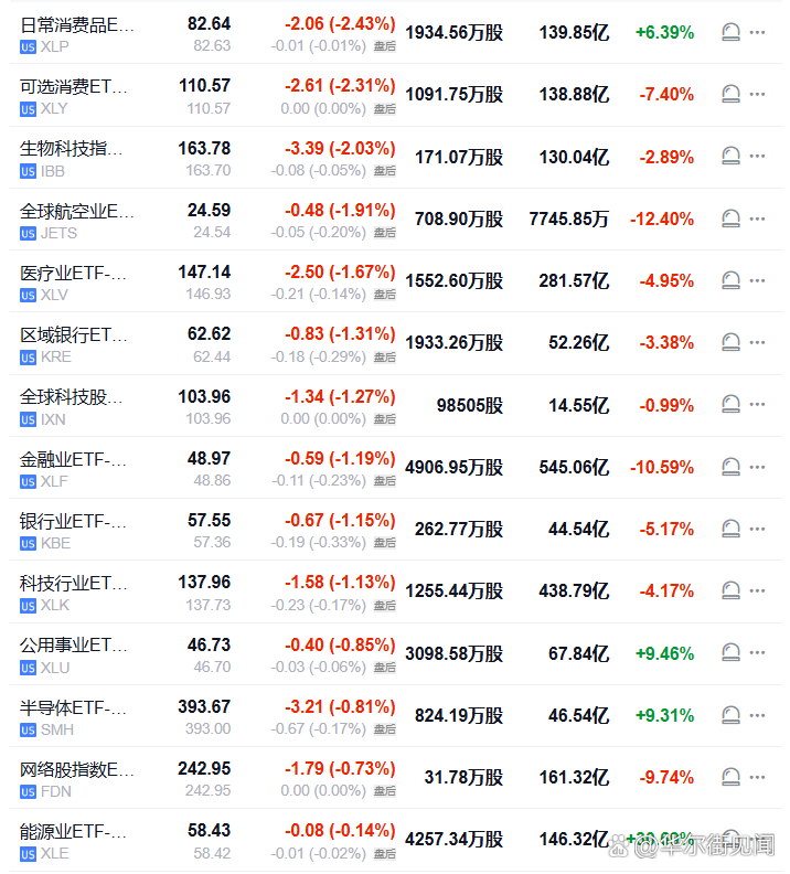 【日常消费品ETF收跌超2.4%,与可选消费ETF领跌美股行业ETF】周三(3月18日),日常消费品ETF收跌2.43%,可选消费ETF跌2.31%,生物科技指数ETF跌2.03%,全球航空业ETF、区域银行ETF、全球科技股指数ETF、金融业ETF、银行业ETF、科技行业ETF等至多跌1.91%,半导体ETF跌0.81%表现“相对靠前”,网络股指数ETF跌0.73%,能源业ETF跌0.14%。