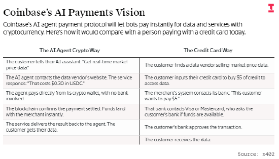 Coinbase 这项布局的核心是其去年开发的支付协议 x402,可让网站轻松接受来自 AI 代理的支付。尽管当前交易量不大,但该协议已成为目前 AI 代理加密支付的基础。
