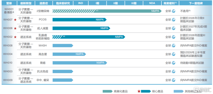 WH006是以SZ-A为原料药研发的天然药物候选产品(参照中药注册分类为中药2.3类),拟用于成人减重。WH006于2025年8月启动II期临床试验。
