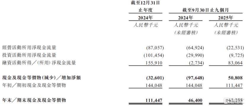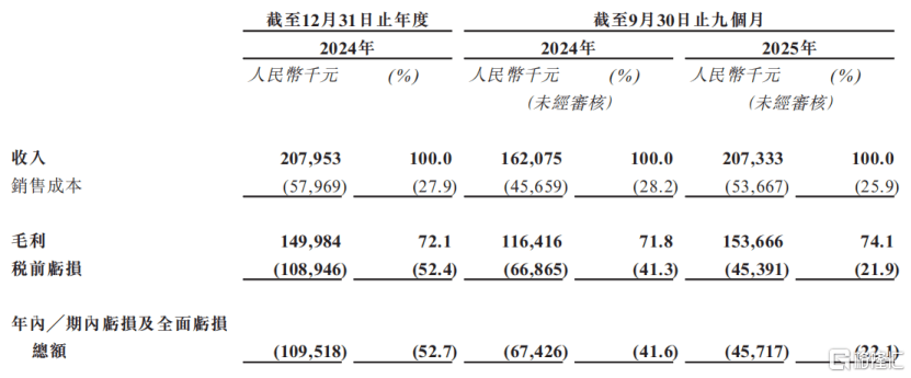 2024年及2025年1-9月(报告期),公司的收入分别为2.08亿元、2.07亿元,净利润分别录得亏损1.1亿元、4572万元。