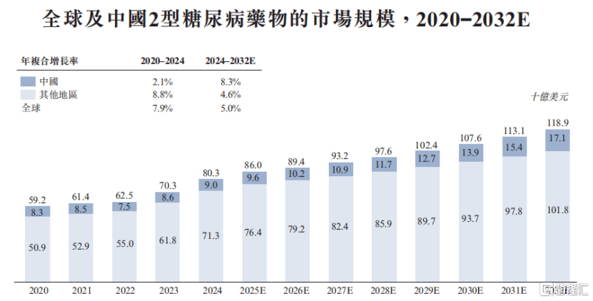 近年来,中国2型糖尿病药物市场受到了越来越多的关注。2024年,全球2型糖尿病药物市场规模约803亿元,预计2032年将增至1189亿元。
