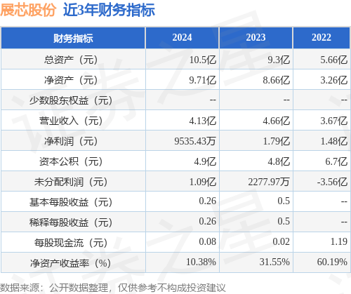 从目前公布的财报来看,展芯股份2024年总资产为10.5亿元,净资产为9.71亿元;近3年净利润分别为9535.43万元(2024年),1.79亿元(2023年),1.48亿元(2022年)。详情见下表: