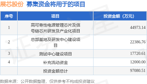 证券之星消息,江苏展芯半导体技术股份有限公司(简称:展芯股份)拟在深交所创业板上市,募资总金额为8.9亿元,保荐机构为华泰联合证券有限责任公司。募集资金拟用于高可靠性电源管理芯片及信号链芯片研发及产业化项目、总部基地及研发中心建设项目、测试中心建设项目、补充流动资金,详见下表: