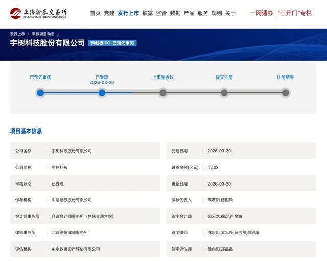 据上海证券交易所网站消息,3月20日,上交所受理宇树科技股份有限公司科创板IPO申请,拟融资金额42.02亿元。