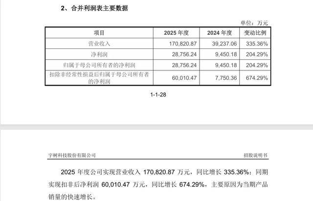 宇树科技披露的招股说明书显示,2025年度公司实现营业收入170820.87万元,同比增长335.36%;同期实现扣非后净利润 60010.47万元,同比增长674.29%,主要原因为当期产品销量的快速增长。