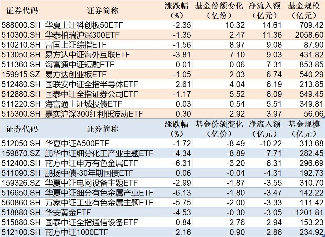 与此同时,华夏中证A500ETF基金份额减少8.49亿份,净流出额10.22亿元;鹏华中证细分化工产业主题ETF基金份额减少8.89亿份,净流出额7.71亿元;南方中证申万有色金属ETF基金份额减少3.20亿份,净流出额6.31亿元。