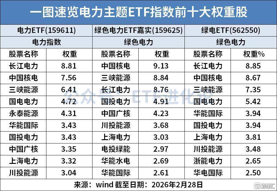 电力ETF跟踪中证全指电力公用事业指数,覆盖火电、水电、核电等全电力板块,成份股以行业龙头为主,前十大含长江电力、中国核电、三峡能源等。