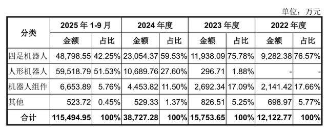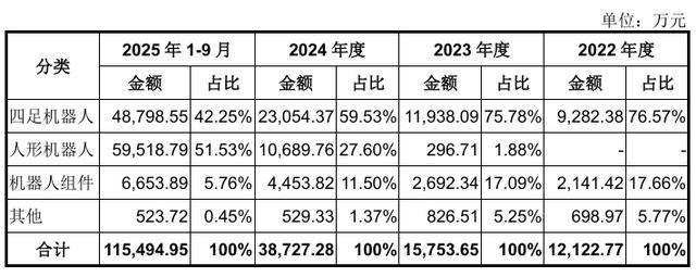 宇树科技的收入结构很清晰:2025年1-9月,人形机器人贡献5.95亿元(占比51.53%),首次超越四足机器人(4.88亿元,占比42.25%),机器人组件收入0.67亿元(占比5.76%)。
