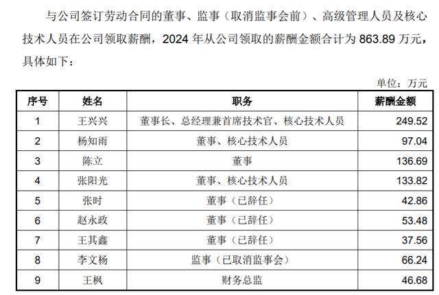 宇树科技披露了2024年董监高薪酬(取消监事会前),合计从公司领取的薪酬金额为863.89万元。