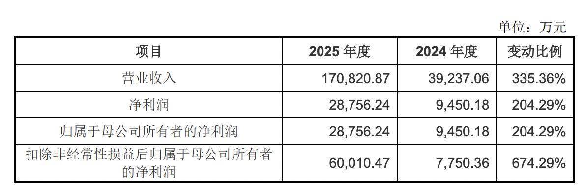2025年,公司营业收入为17.08亿元,同比增长335.36%;净利润为2.88亿元,同比增长204.29%。