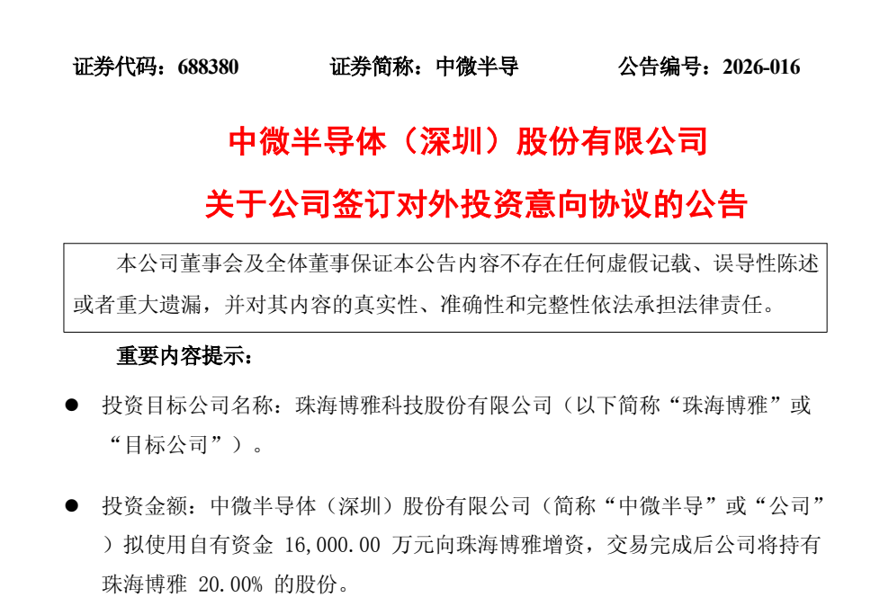 公告显示,中微半导拟使用自有资金1.6亿元向珠海博雅进行增资,认购珠海博雅1250万元的新增注册资本,其余1.475亿元计入资本公积。交易完成后,珠海博雅将成为公司的参股公司。