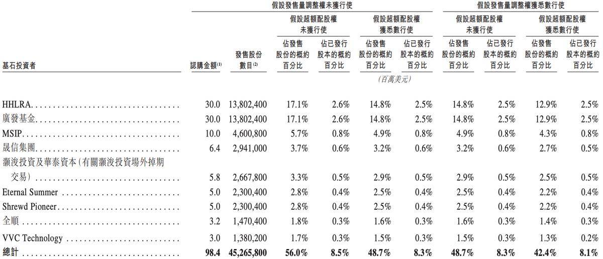 据贝多商业&贝多财经了解,华沿机器人引入了9名基石投资者,合共认购该公司约9840万美元(约7.70亿港元)的发售股份,包括HHLRA、广发基金、MSIP、晟信集团、灏浚投资、华泰资本、Eternal Summer、Shrewd Pioneer等。