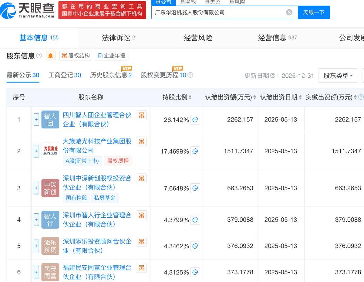 天眼查App信息显示,华沿机器人成立于2017年9月,前身为深圳市大族机器人有限公司。目前,该公司的注册资本约为9013.9万元,法定代表人为王光能,主要股东包括大族激光(SZ:002008)等。
