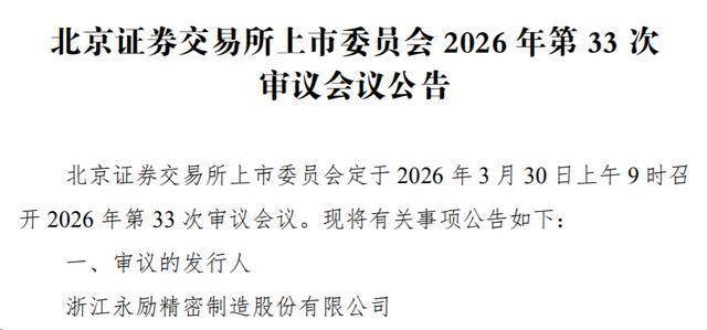 瑞财经 王敏 北交所上市委员会2026年第33次审议会议公告显示,浙江永励精密制造股份有限公司(以下简称“永励精密”)IPO将于3月30日上会,保荐机构为平安证券。