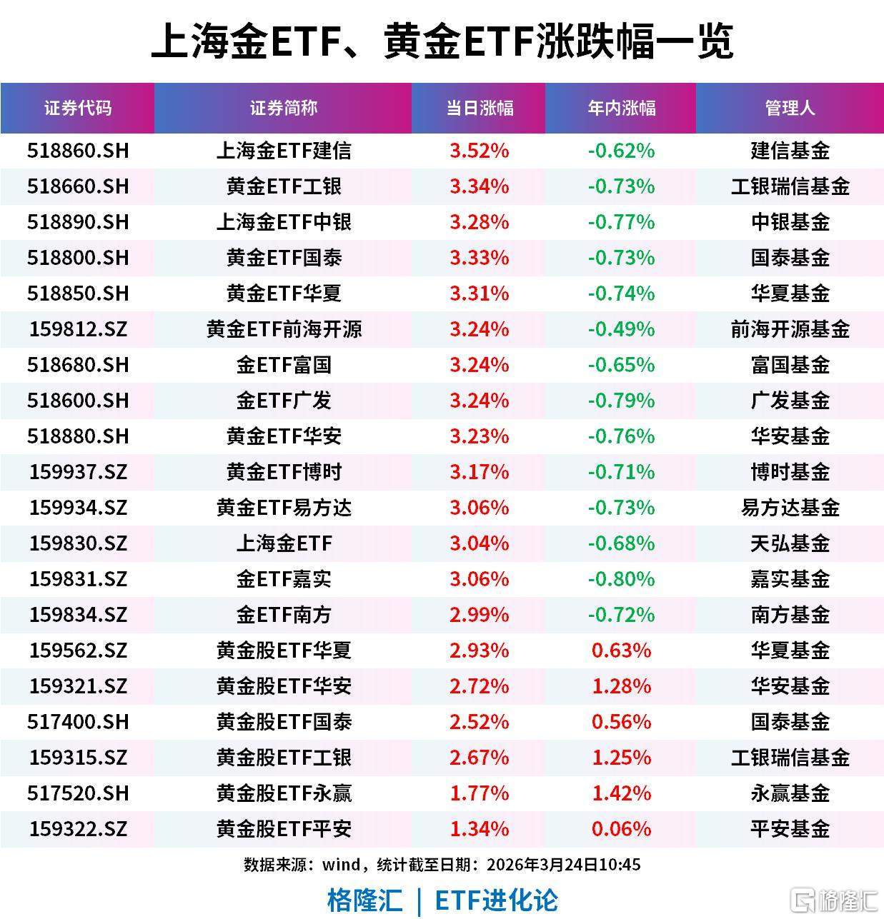 黄金主题ETF迎来反弹,上海金ETF建信、黄金ETF工银、上海金ETF中银、黄金ETF国泰、黄金ETF华夏、黄金ETF前海开源、金ETF富国、金ETF广发、黄金ETF华安、黄金ETF博时、黄金ETF易方达、上海金ETF、金ETF嘉实涨超3%;金ETF南方、黄金股ETF华夏、黄金股ETF华安、黄金股ETF国泰、黄金股ETF工银、黄金股ETF永赢、黄金股ETF平安上涨。