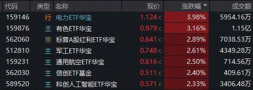 A股方面,电力爆发涨停潮,“风光水火核”全布局的电力ETF华宝(159146)劲涨近4%,资金近五日加码超6300万元。覆盖黄金、稀土、铜铝等有色龙头的有色ETF华宝(159876)反弹超3%,终结日线九连阴。军工、航空异动走高,军工ETF华宝(512810)、通用航空ETF华宝(159231)涨超2.5%!