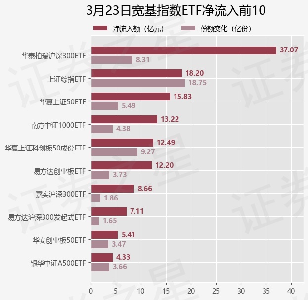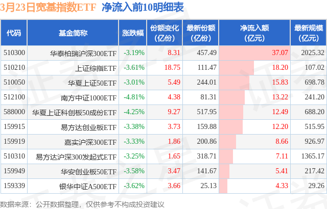 当日有145只宽基指数ETF基金出现资金净流入,其中净流入排首位的是华泰柏瑞沪深300ETF(510300),份额增加了8.31亿份,净流入额为37.07亿元。