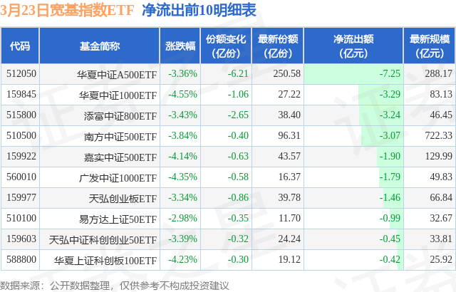 当日有63只宽基指数ETF基金出现资金净流出,其中净流出排首位的是华夏中证A500ETF(512050),份额减少了6.21亿份,净流出额为7.25亿元。