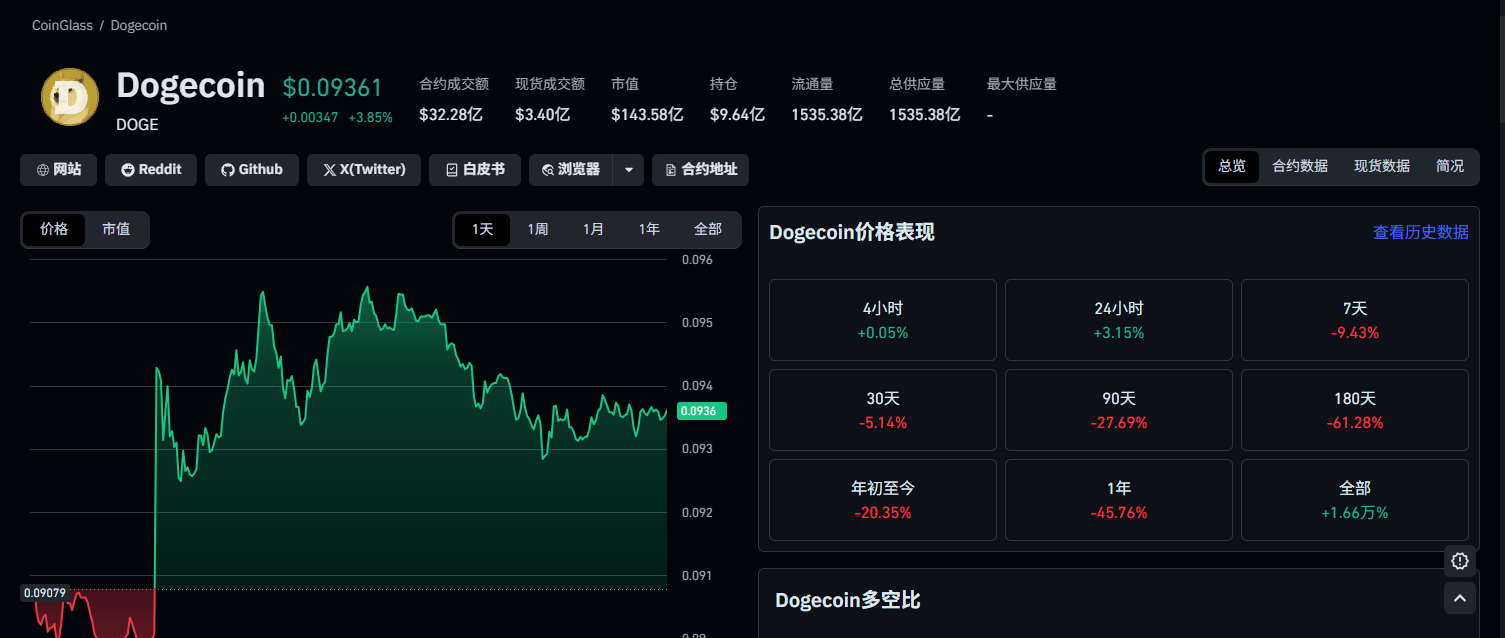 Dogecoin(DOGE)当前价格约为0.09361美元,较近期高点显著回落,24小时内小幅上涨约3.85%,但整体仍处于中长期下行通道中。