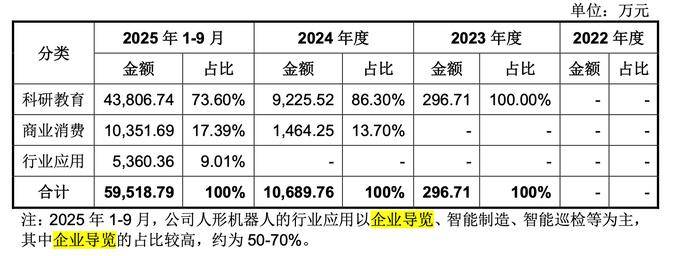 2025年前三季度,宇树科技人形机器人收入中科研教育占比73.6%,商业消费占17.4%,行业应用仅占9%。行业应用中,50%-70%用于企业导览,智能制造、智能巡检、物流配送等硬核场景仅占29.29%。这意味着号称“颠覆工业”的人形机器人,目前主要工作仍是在企业内执行迎宾接待、路线引导等任务。