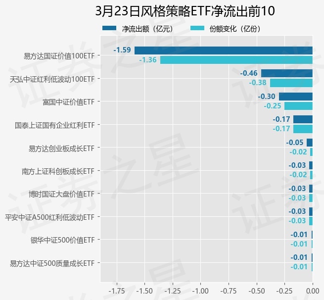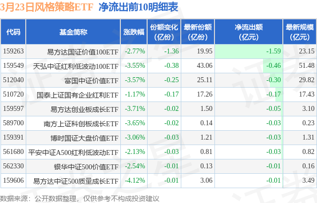 当日有15只风格策略ETF基金出现资金净流出,其中净流出排首位的是易方达国证价值100ETF(159263),份额减少了1.36亿份,净流出额为1.59亿元。