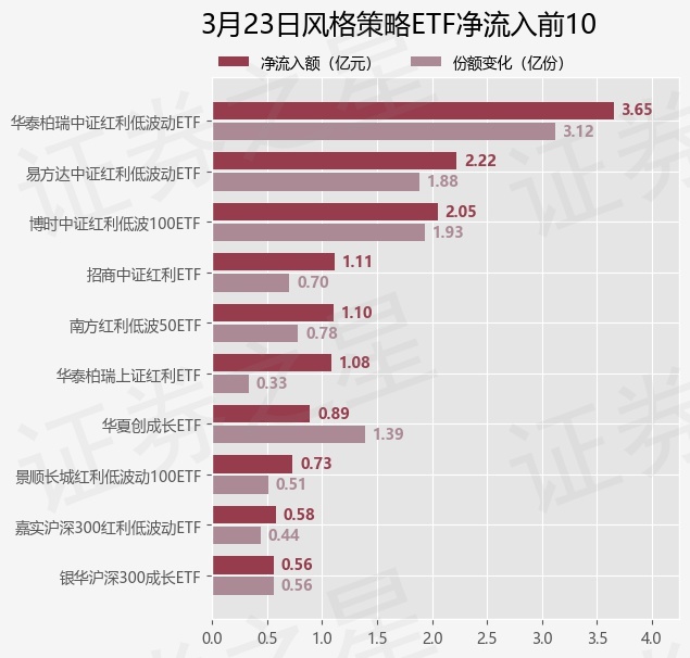 当日有35只风格策略ETF基金出现资金净流入,其中净流入排首位的是华泰柏瑞中证红利低波动ETF(512890),份额增加了3.12亿份,净流入额为3.65亿元。