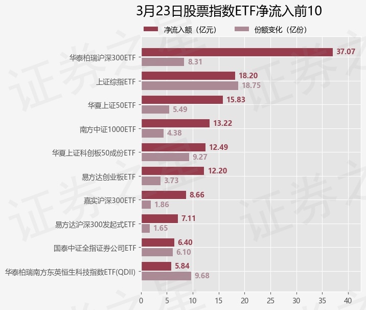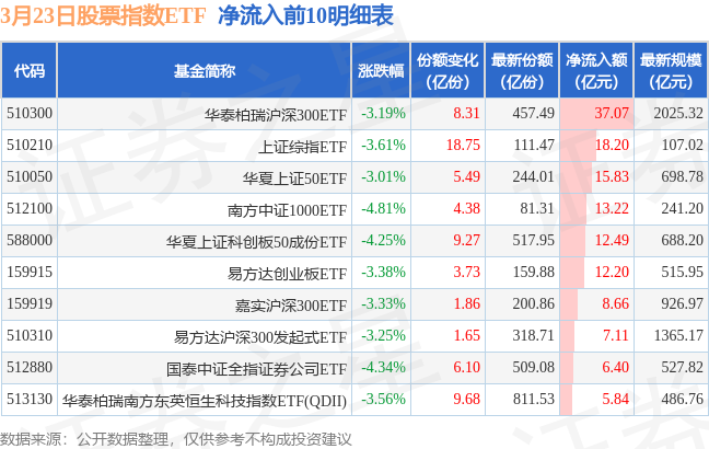 当日有606只股票指数ETF基金出现资金净流入,其中净流入排首位的是华泰柏瑞沪深300ETF(510300),份额增加了8.31亿份,净流入额为37.07亿元。