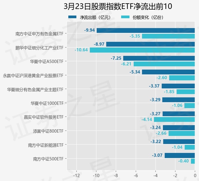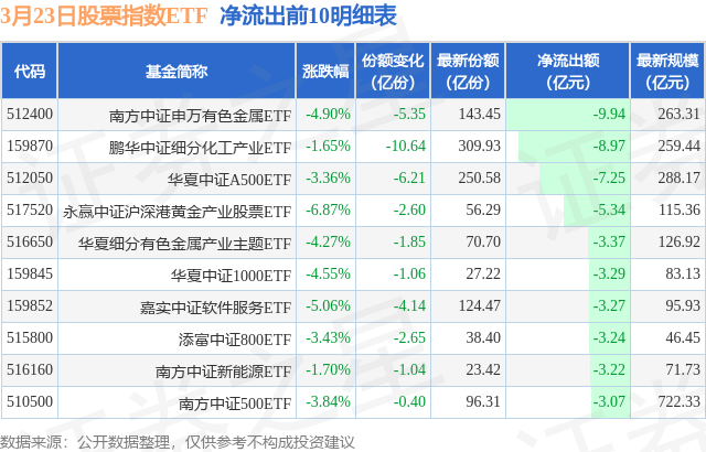 当日有312只股票指数ETF基金出现资金净流出,其中净流出排首位的是南方中证申万有色金属ETF(512400),份额减少了5.35亿份,净流出额为9.94亿元。