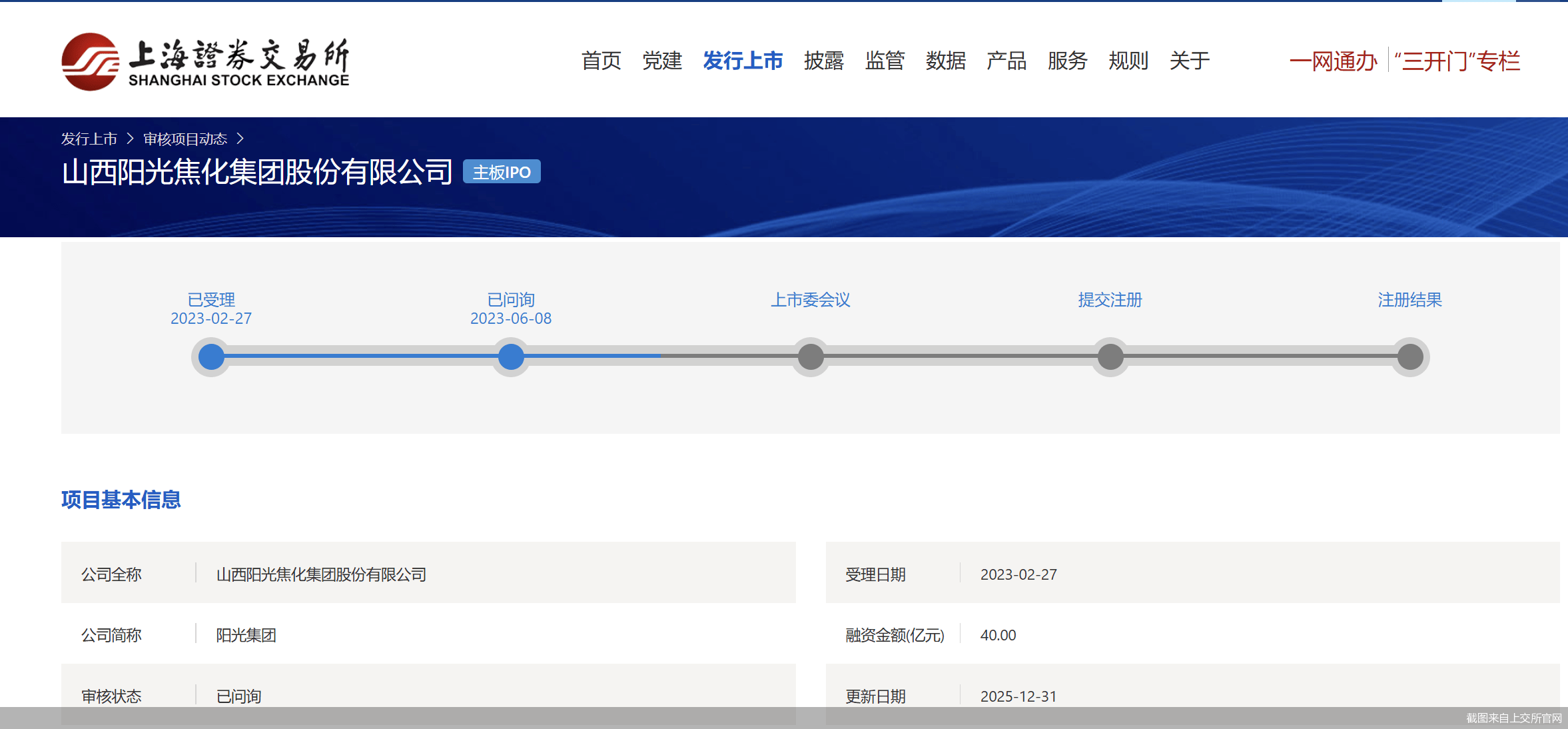 据了解,阳光集团主营业务为煤化工产品和精细化工产品的生产与销售,公司IPO于2023年2月27日获得受理,当年6月8日进入问询阶段。