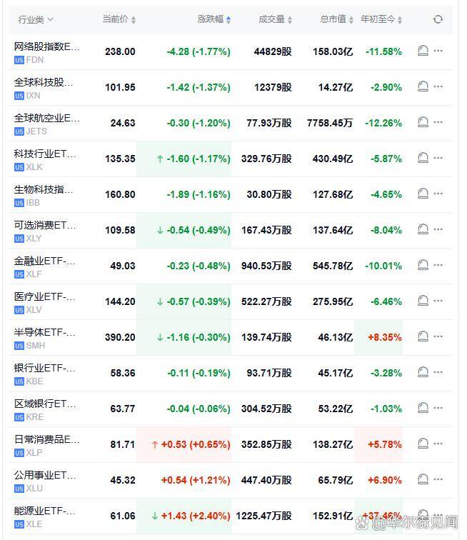 美股盘初主要行业ETF多数下跌,网络股指数ETF跌近2%,全球科技股指数ETF、全球航空业ETF跌超1%,能源业ETF涨超2%。