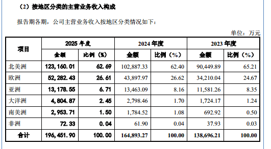 从市场布局来看,公司收入完全依赖境外市场,其中北美洲是第一大创收区域,报告期内向北美洲产生的销售收入分别为90449.89万元、102887.33万元、123160.01万元,分别占当期主营业务收入的65.21%、62.4%、62.69%。