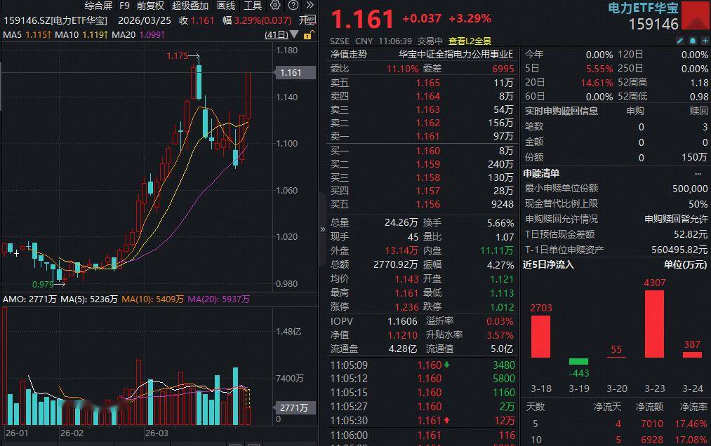 全方位把握能源机遇,建议关注电力ETF华宝(159146),标的指数聚焦电力公用事业领域,全面布局火电、水电、风电、核电及光伏,既能捕捉新能源装机爆发的成长弹性,又能依托传统电力龙头的高股息与稳定现金流平滑市场波动,实现“防守底仓+成长弹性”的双重适配。注:场外联接基金(代码:026949)火热发行中!