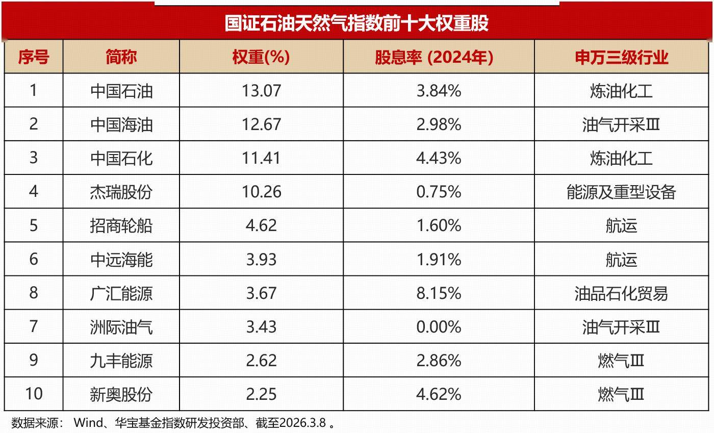 截至2026年3月8日,国证石油天然气指数成份股为50只,覆盖石油天然气勘探开发、油气设备与服务、燃气输配销售等石油天然气产业相关领域。按申万一级行业统计,其石油石化行业占比为58.62%,核心行业权重高;按申万三级行业统计,其炼化、开采、设备、燃气分别占25.38%、16.64%、14.5%、13.7%,油气重点细分行业分布相对均衡。该指数成份股组合结构兼顾价值与成长,其中大市值央企提供相对稳定盈利与分红基础,中小市值公司捕捉油服、油运等细分机会。