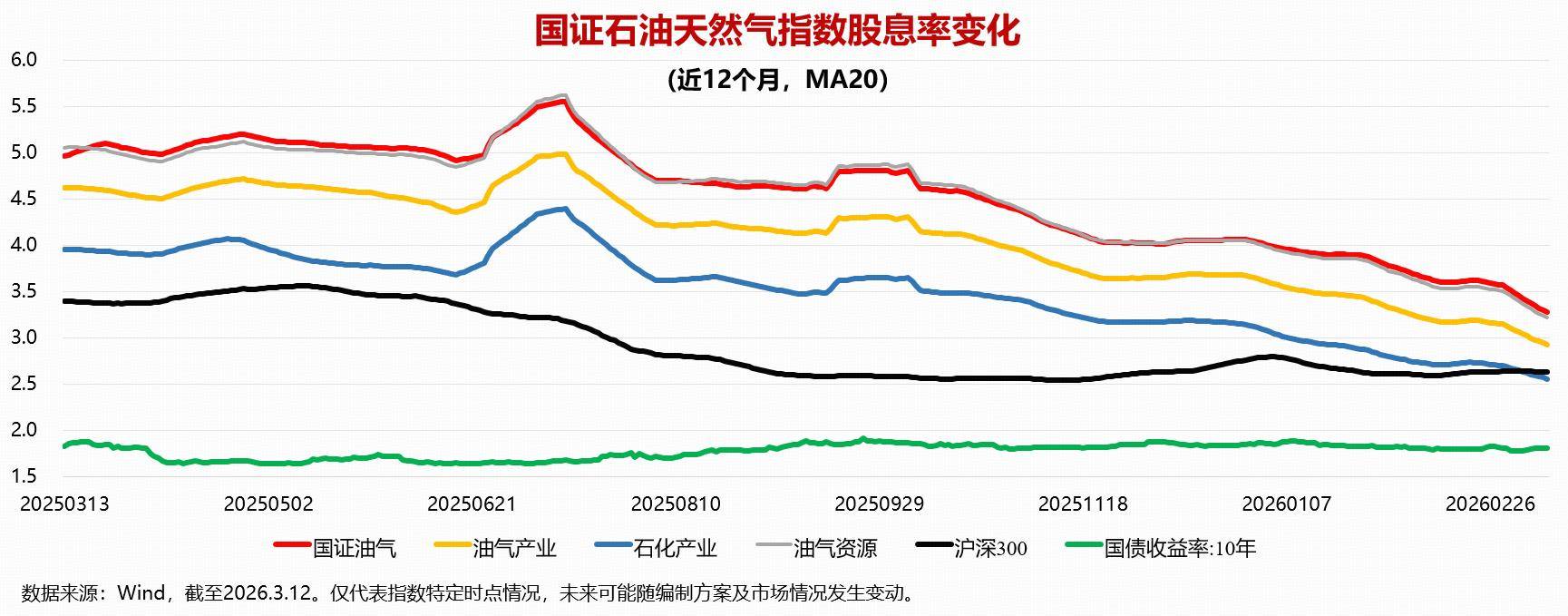 国证石油天然气指数历史走势与油价高度相关,与布油价格走势整体同步,油价下行阶段指数表现承压,而近期油价回升带动指数明显修复。我国能源安全政策推动长期资源开发投入,同时央企高分红策略吸引长期资金配置,使油气板块逐步呈现“周期属性弱化、红利属性增强”的特征。截至2026年3月12日,国证石油天然气指数近12个月股息率约为3.18%,明显高于沪深300指数及石化产业指数,在主要能源指数中处于较高区间。在当前利率维持低位、资金偏好高股息资产的环境下,具备分红优势与行业资源禀赋的国证石油天然气指数,仍有望持续提供具有吸引力的现金回报。