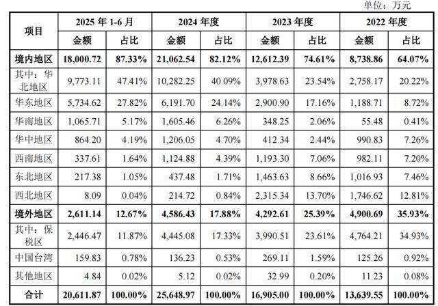 报告期内,超纯股份等境内地区销售占比不断提升,由2022年的64.07%升至2025年上半年的87.33%,尤其是华北、华东地区,2025年上半年收入占比达到75%。