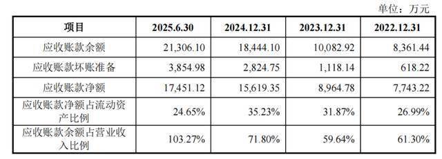 公司应收账款周转率由2022年1.99次降至2025年上半年的1.04次。各期计提应收账款坏账准备分别为618.22万元、1,118.14万元、2,824.75万元、3,854.98万元,计提比例7.39%、11.09%、15.32%、18.09%。