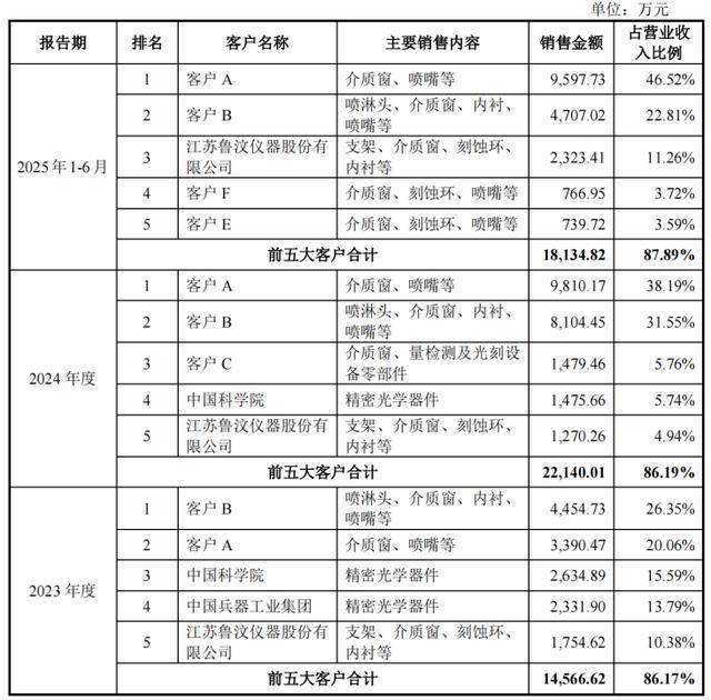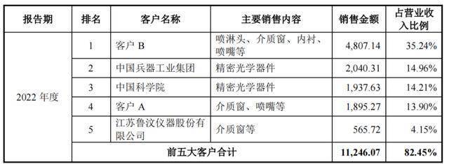 报告期内,超纯股份向前五大客户的销售金额分别为1.12亿元、1.46亿元、2.21亿元及1.81亿元,占总销售额的比例为82.45%、86.17%、86.19%及87.89%。