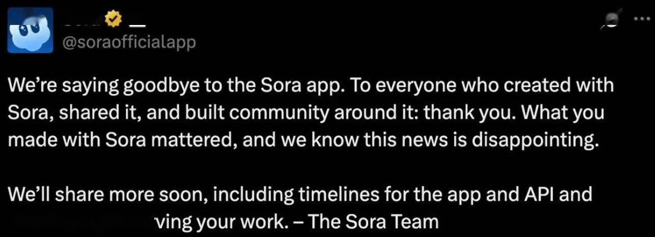 刚刚,OpenAI官方发布简短声明,正式宣布关停视频生成应用Sora。这个曾霸榜App Store、被视为“AI视频社交杀手锏”的现象级产品,从上线到落幕仅经历了6个月的生命周期。