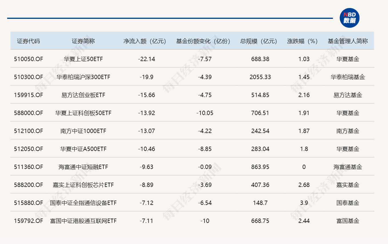 与此同时,华夏上证50ETF基金份额减少7.57亿份,净流出额22.14亿元;华泰柏瑞沪深300ETF基金份额减少4.39亿份,净流出额19.90亿元;易方达创业板ETF基金份额减少4.75亿份,净流出额15.66亿元。