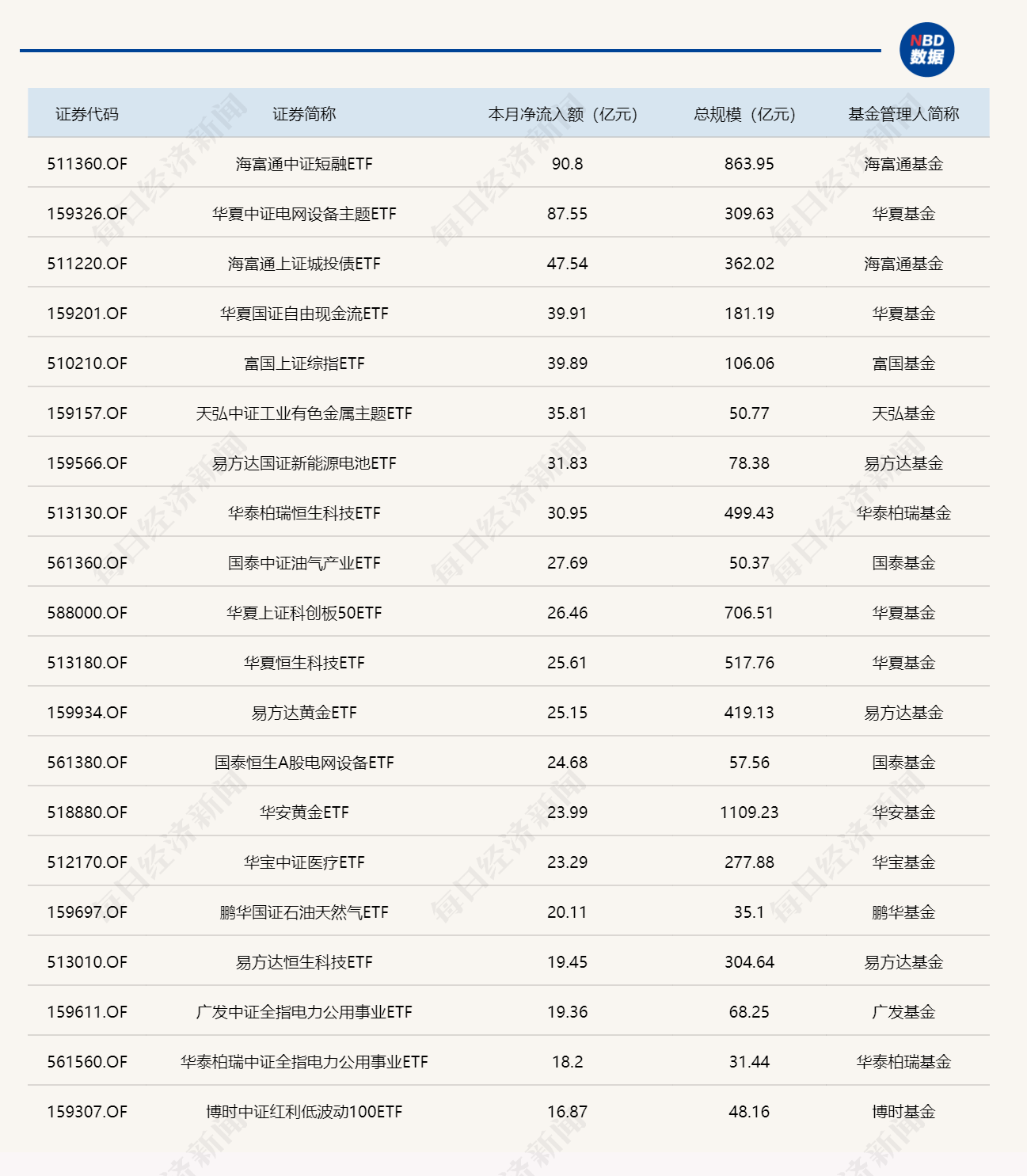 截至3月25日,本月资金净流入额居前20的ETF名单如下: